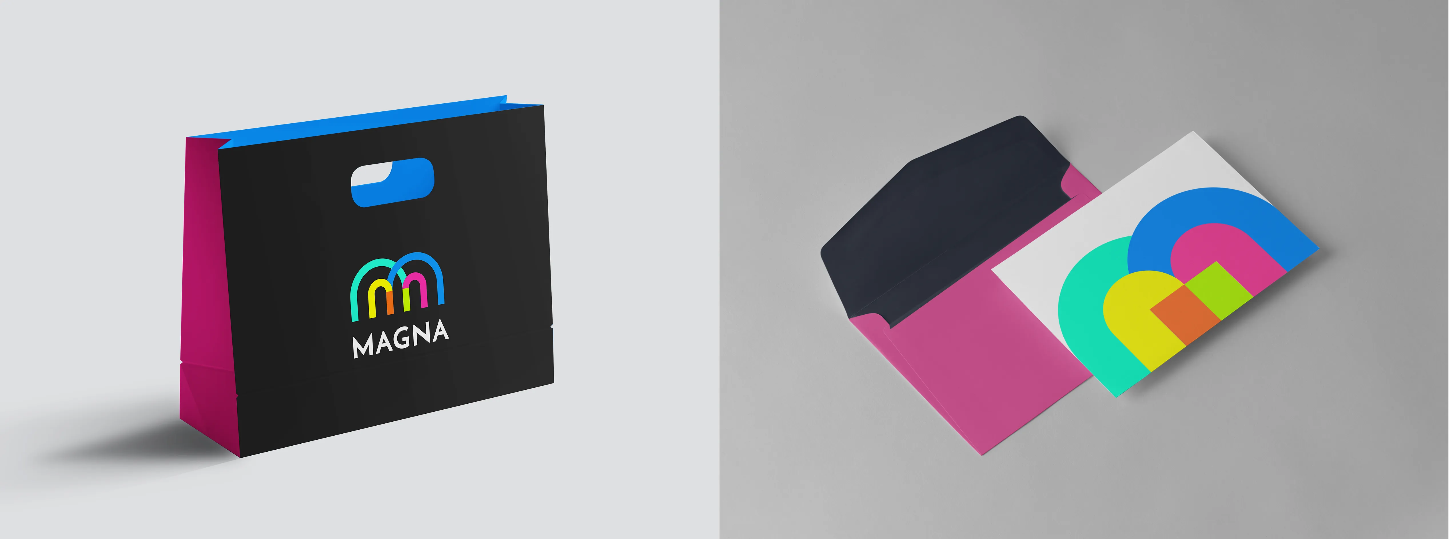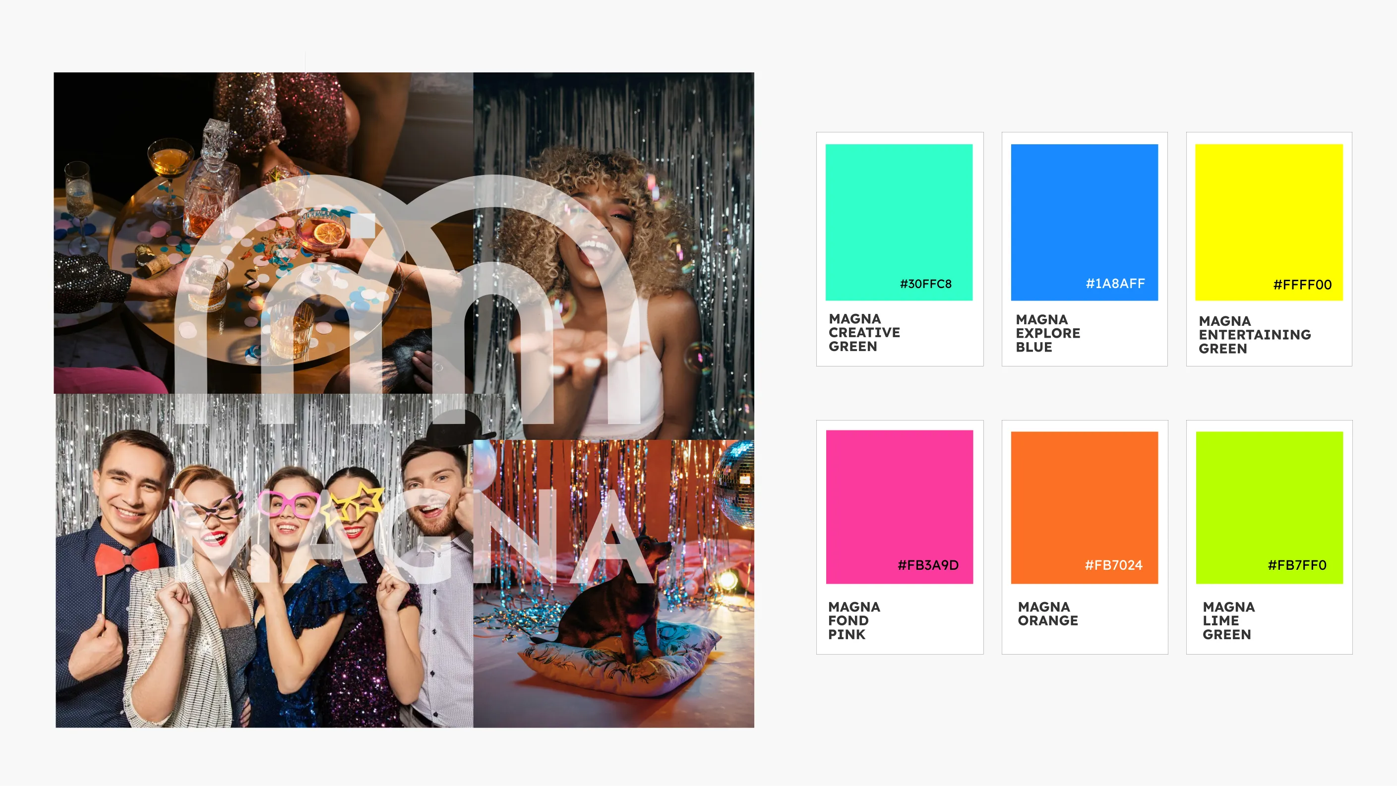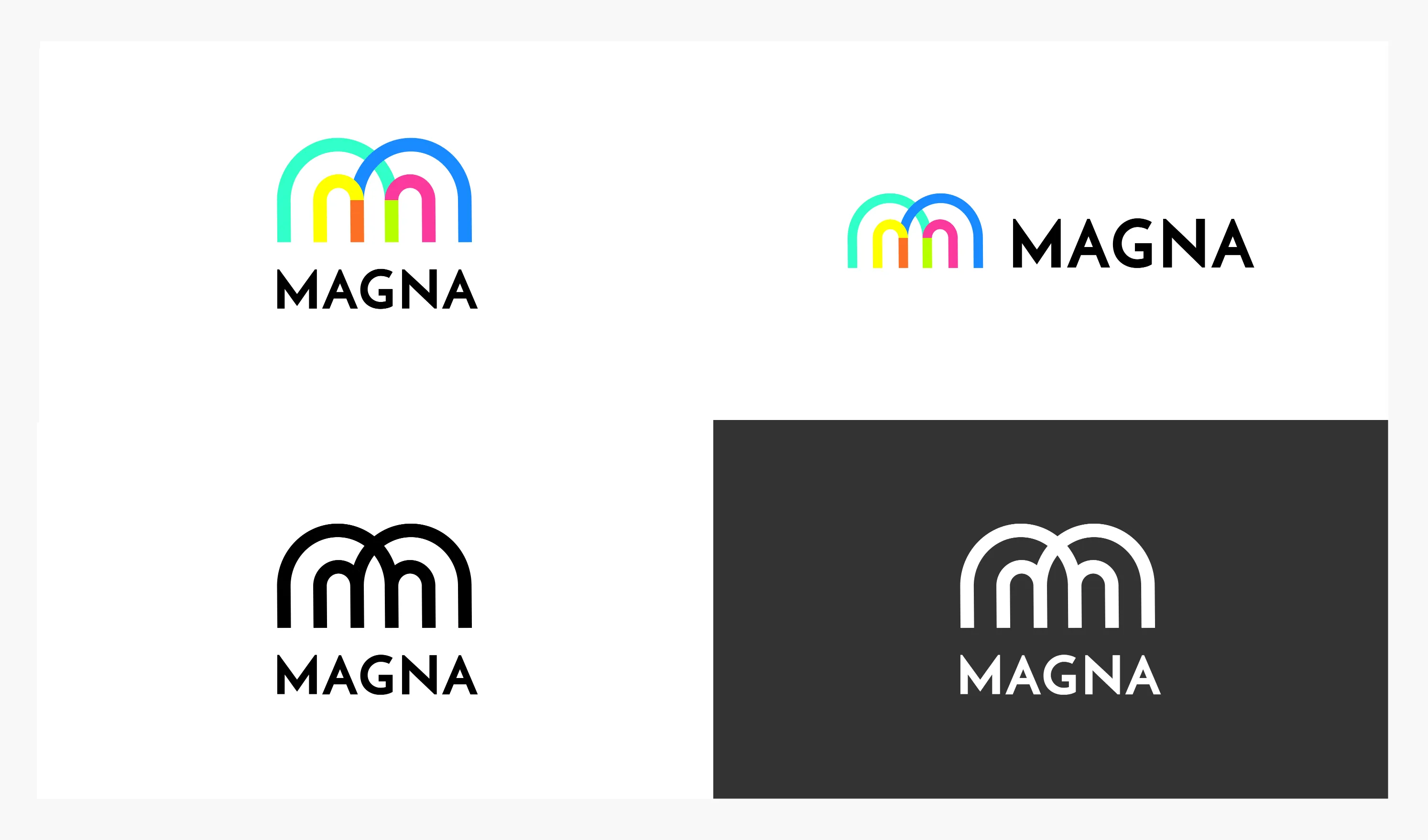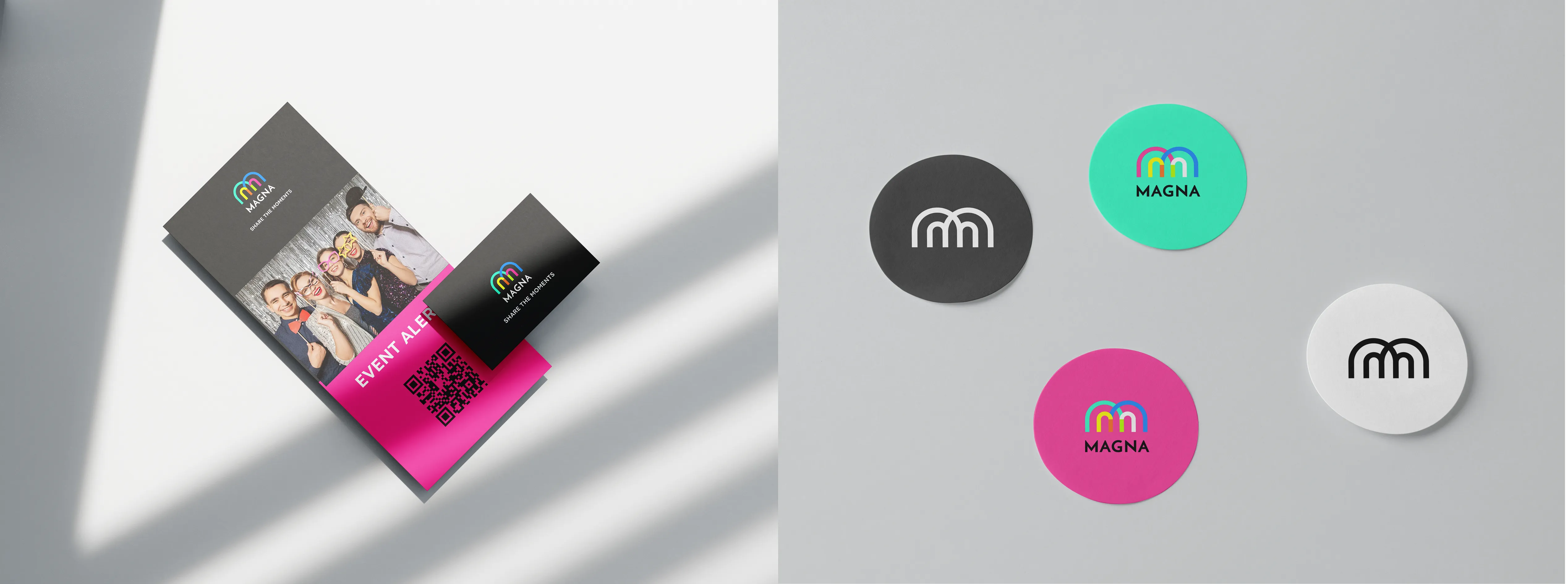The Magna logotype is designed around two magnet shapes seamlessly merging to form the letter "M," symbolizing both connection and attraction. This design also reflects Magna’s core concept—capturing fun moments and turning them into refrigerator magnets that guests can take home as lasting memories from the event. This symbolic representation not only reinforces the essence of connection and attraction but also embodies the core identity of the MAGNA brand.